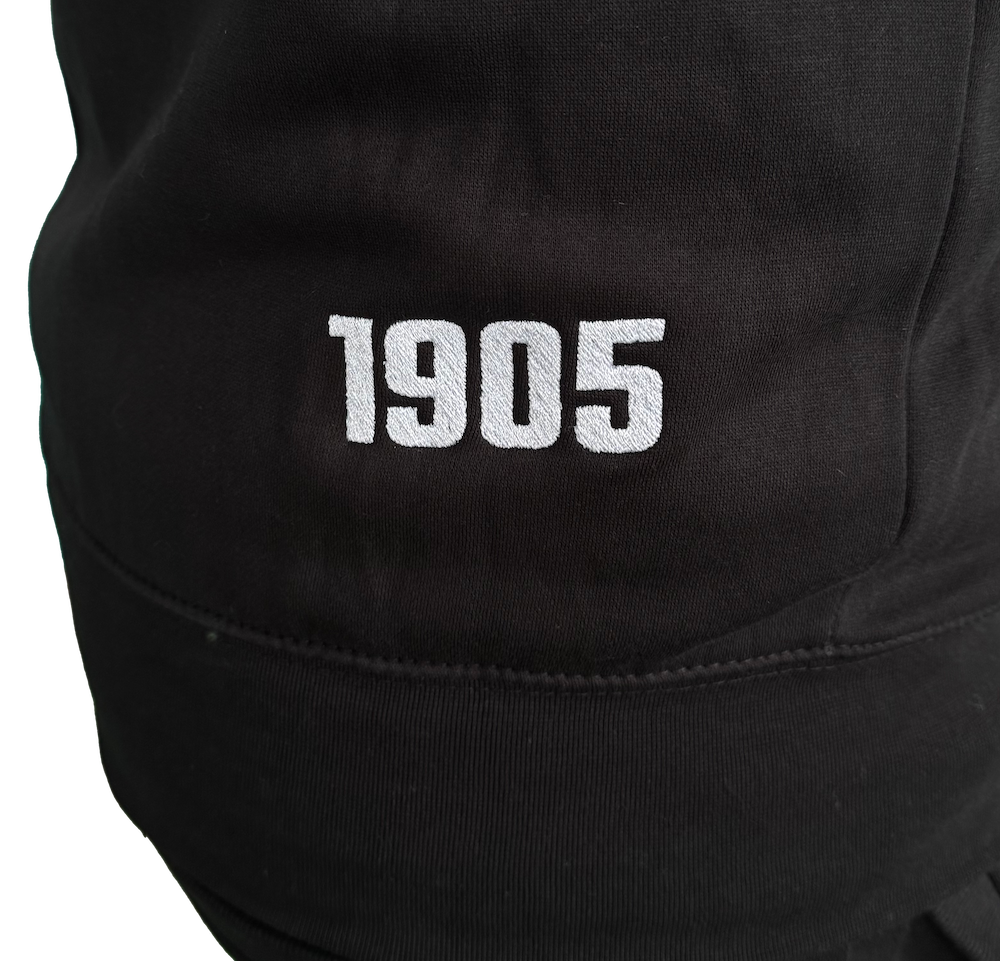 Tepláky mají na levém stehně výšivku znak Bohemians Praha 1905 a na levé nohavici je výšivka 1905.