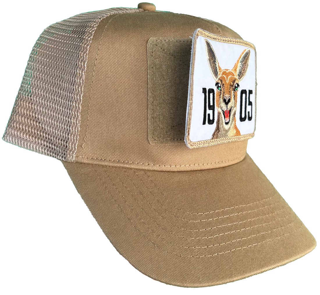• Béžový kšiltovka s vyměnitelným štítkem na suchý zip, výšivka klokana a 1905
