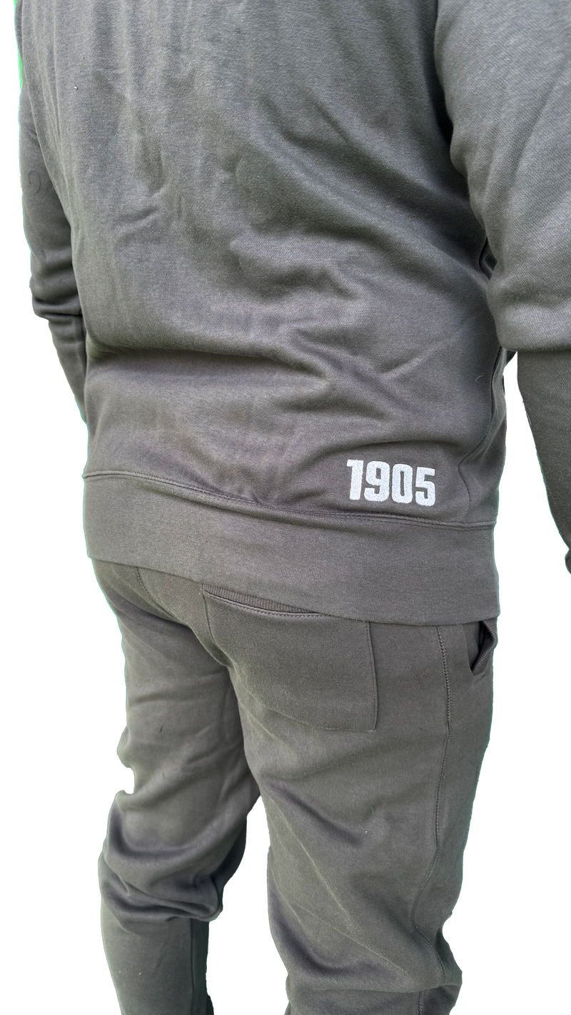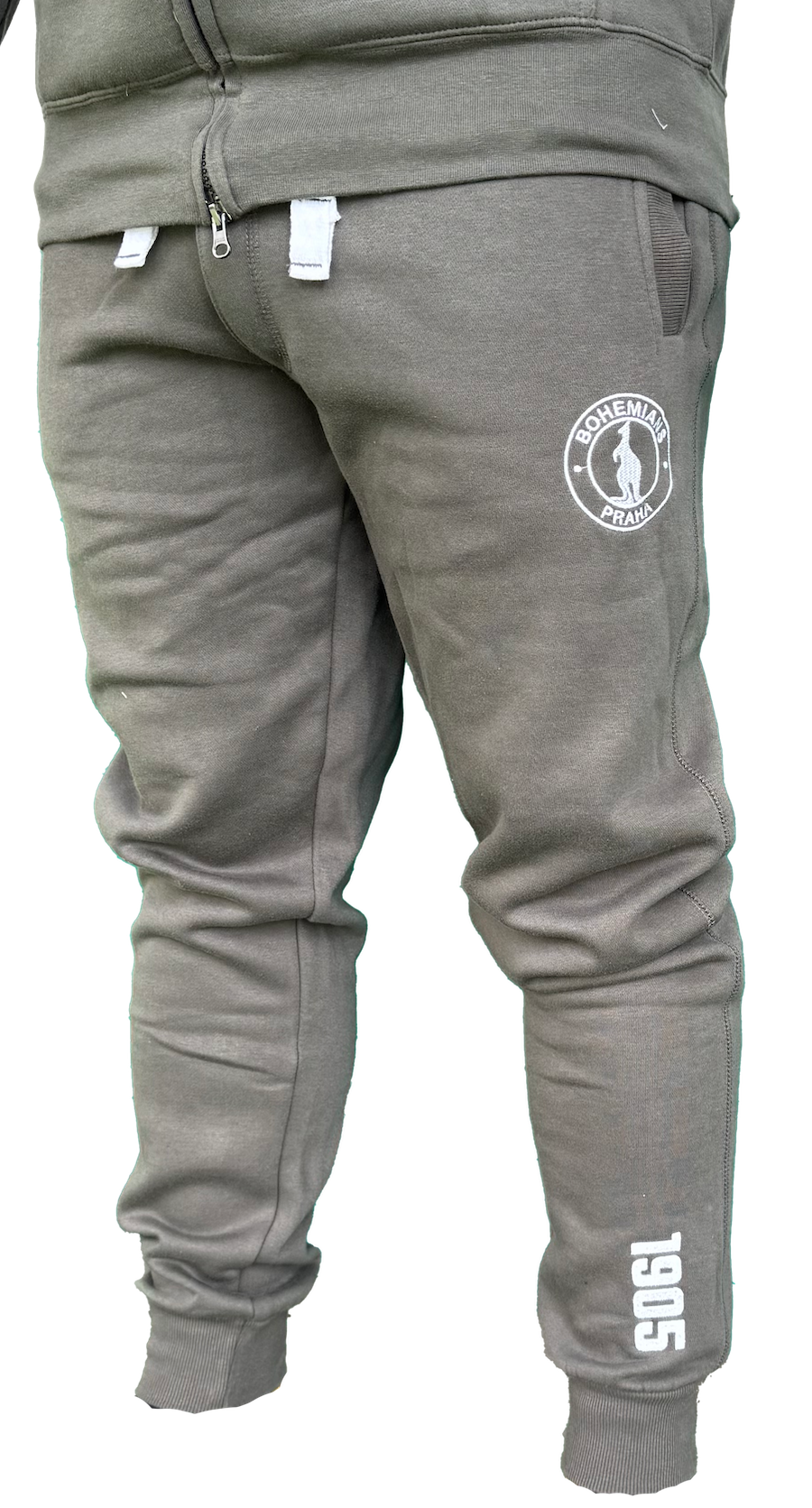 Tepláky mají na levém stehně výšivku znak Bohemians Praha 1905 a na levé nohavici je výšivka 1905.