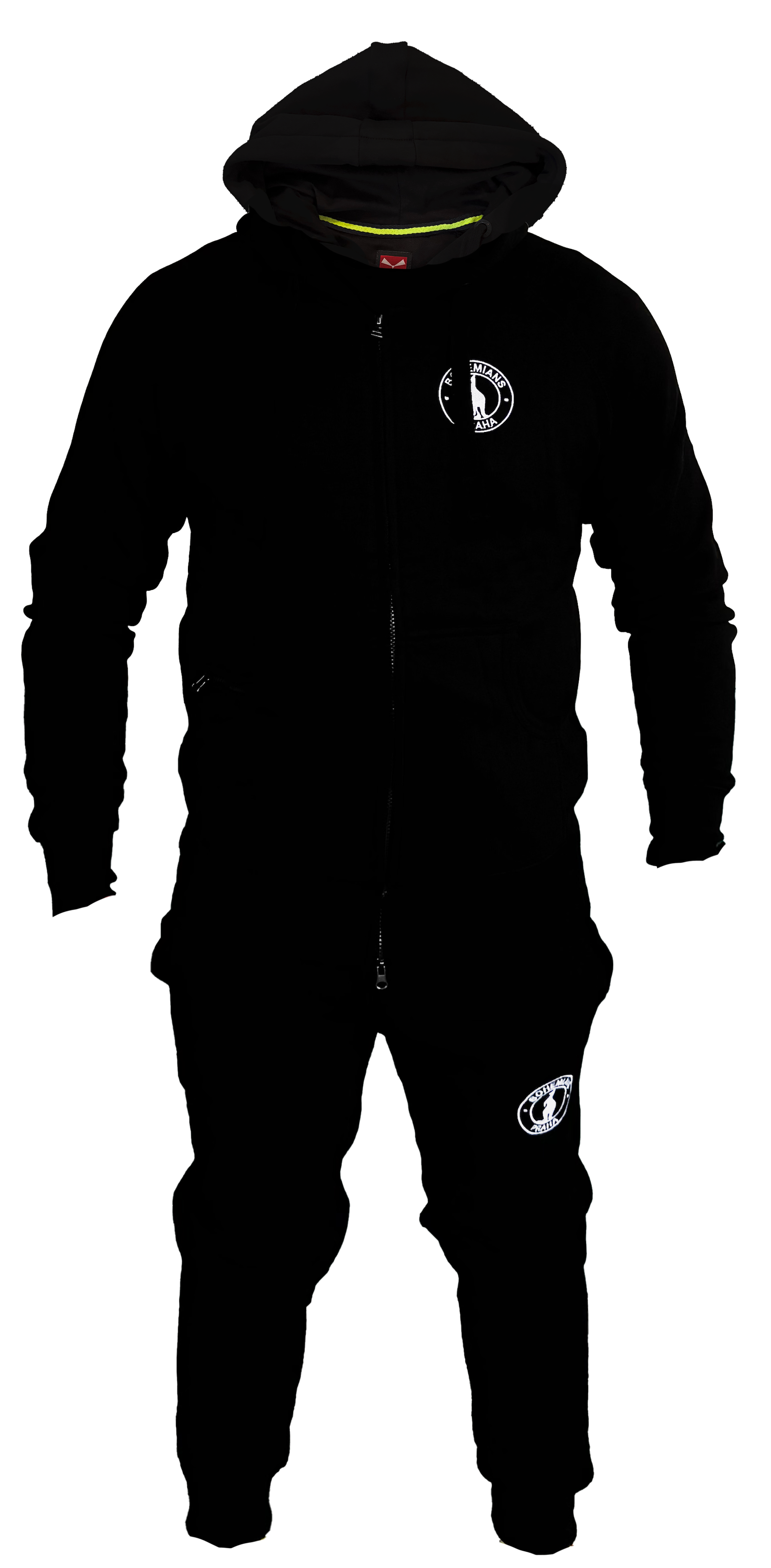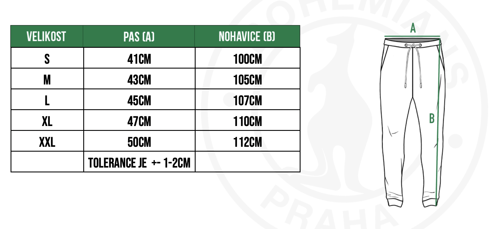 Tepláky mají na levém stehně výšivku znak Bohemians Praha 1905 a na levé nohavici je výšivka 1905.